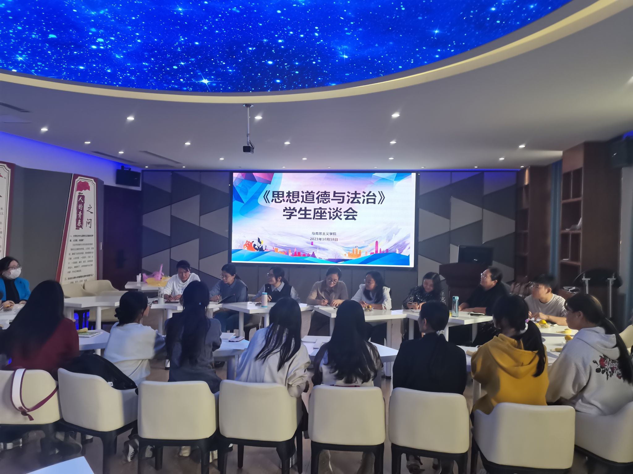 为进一步提升思想道德与法治课教学质量,倾听学生心声,10月18日下午,思想道德与法治教研室在综合楼B302立德普法实践演练教室开展新生开学首次座谈会,师生各抒己见、交流碰撞,气氛欢快而和谐。