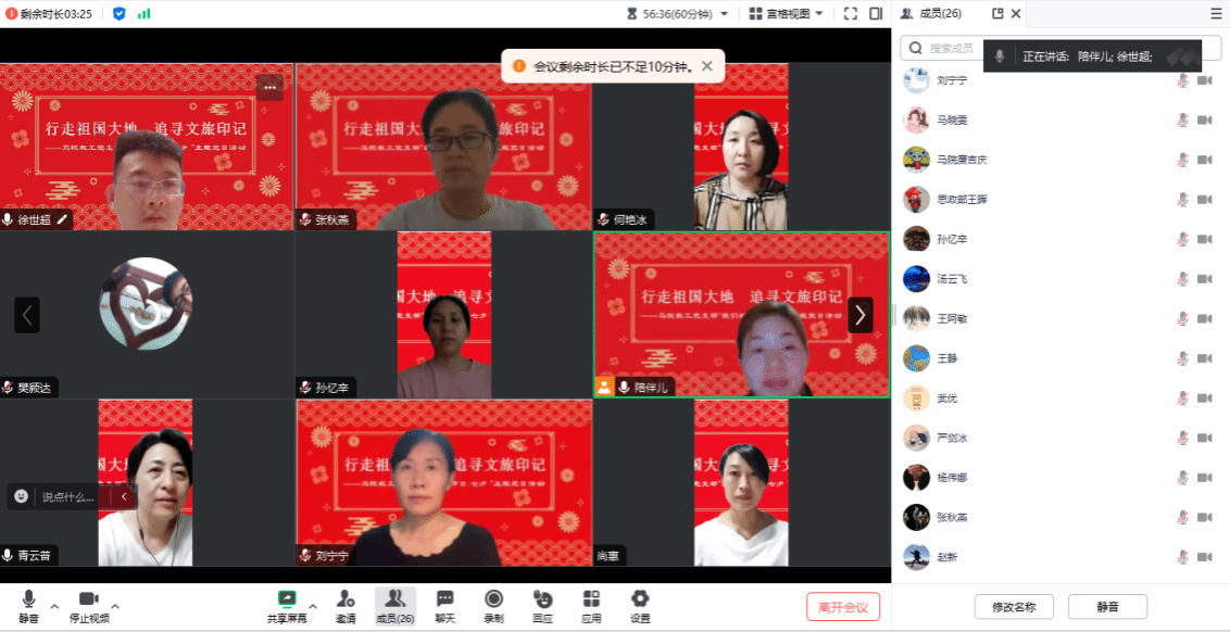为进一步学习宣传贯彻党的二十大精神,推进文旅融合,落实“时代新人铸魂工程”,传承和弘扬中华优秀传统文化,在中华民族传统节日“七夕”来临之际,马院教工党支部于8月20日开展“行走祖国大地 追寻文旅印记”线上主题党日活动,邀请部分老师分享暑期游历,全体党员共观万里河山,品中国文化和中国精神,活动由教工党支部组织委员刘丽军主持。
