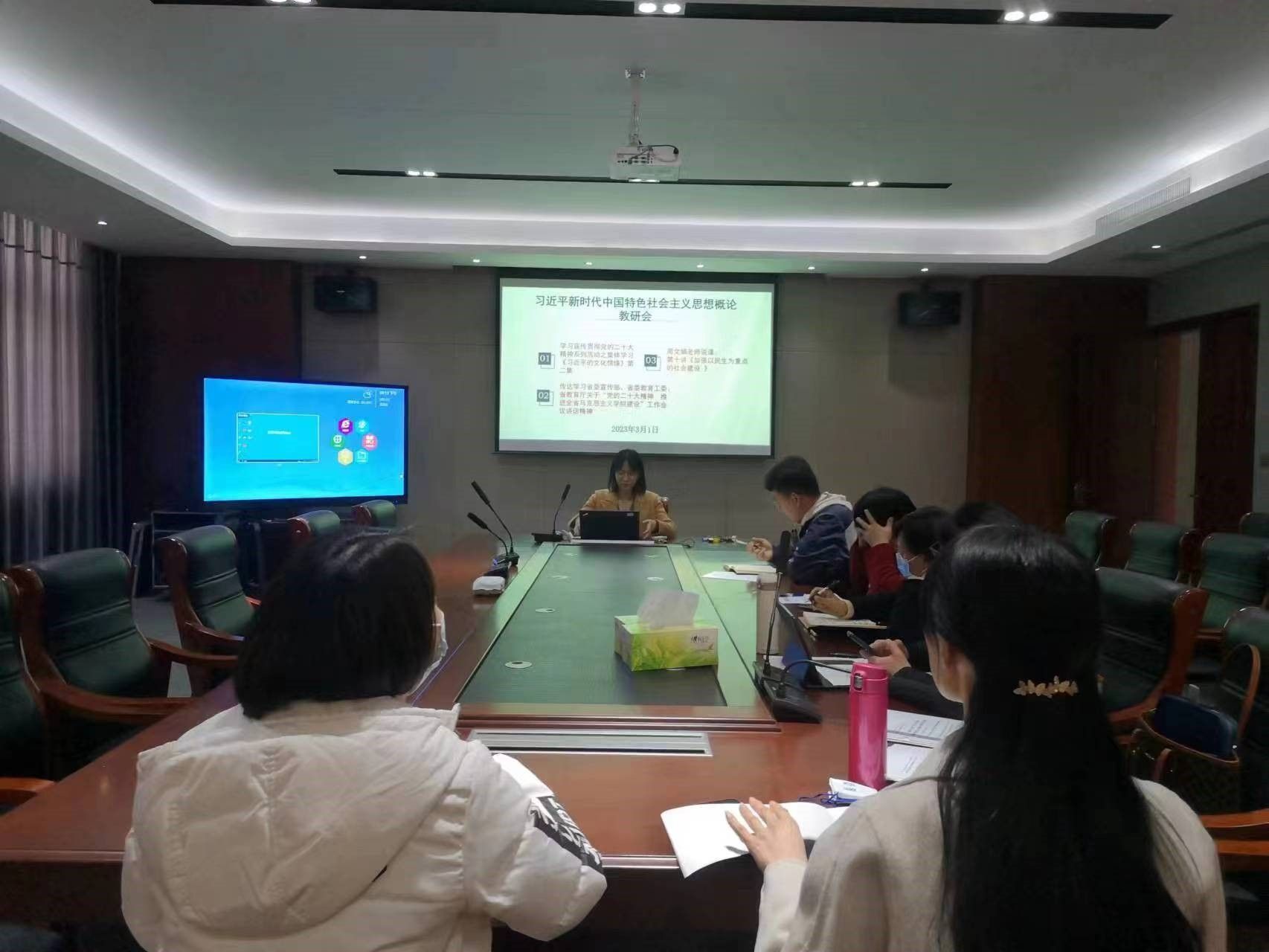 3月1日下午,习近平新时代中国特色社会主义思想概论教研室全体专职教师在综合楼三楼学习研讨中心召开了教研会。为进一步深入学习贯彻党的二十大报告精神,建设马克思主义学院学习型党支部,提高党员教师的学习本领和理论水平,会议首先学习了《习近平文化情缘》第二集视频,通过学习,使大家了解了敦煌文化的独特魅力和保护传承敦煌文化的重要意义,帮助大家更好地把讲好敦煌文化故事、“一带一路”的故事融入到课程中,引导青年学生共筑民族文化自信。