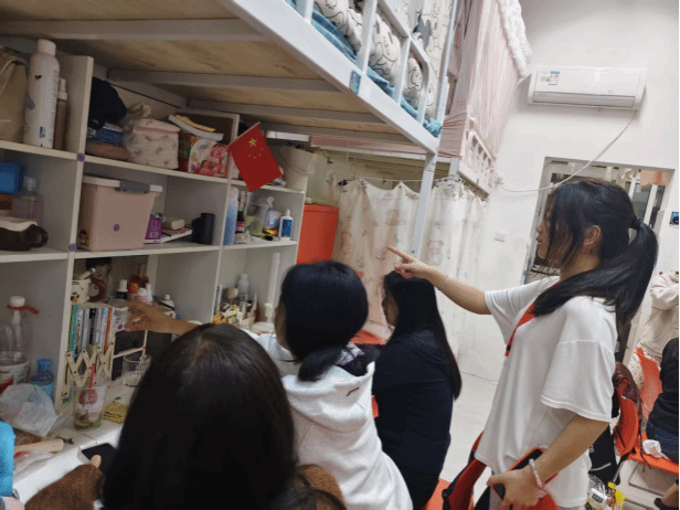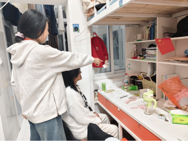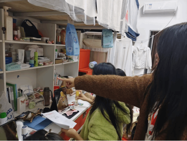 在实际指导环节,学长们走进每一间新生宿舍,针对不同宿舍的布局和实际情况,给予个性化指导。面对物品杂乱堆放的宿舍,学长们现场演示收纳技巧,“可以利用分层收纳盒存放衣物和生活用品,充分利用垂直空间;鞋子可以按照季节或穿着频率整齐摆放在鞋架上,避免随意堆放占用空间。