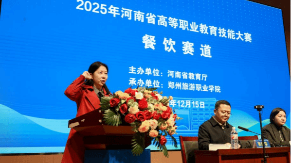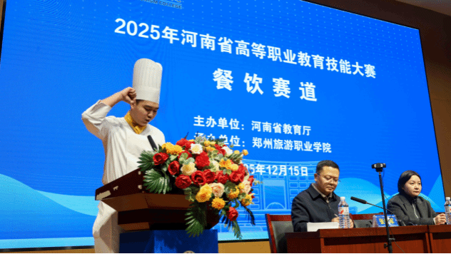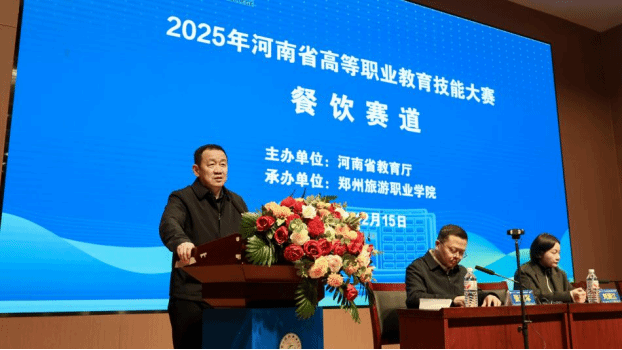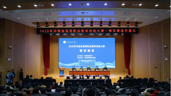 2025年12月15日下午,由河南省教育厅主办,郑州旅游职业学院承办的2025年河南省高等职业教育技能大赛(餐饮赛道)在2B教学楼礼堂正式开幕。