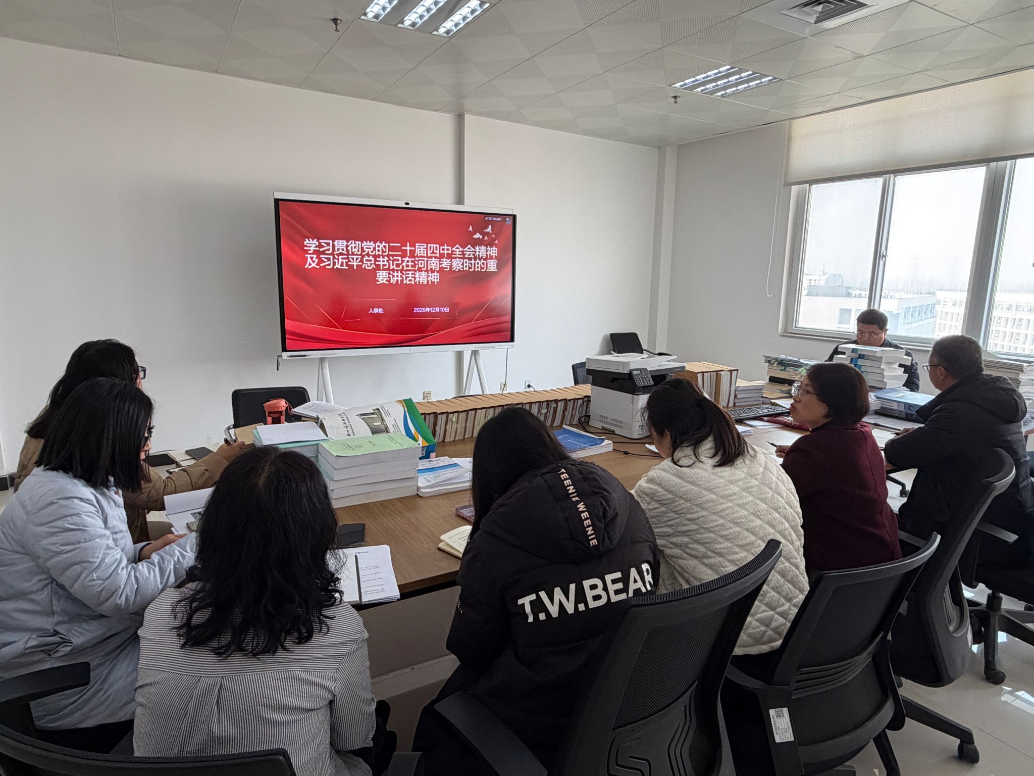 为深入学习贯彻党的二十届四中全会精神,切实强化思想政治引领,12月10日下午,人事处组织专题思政学习活动,人事处处长张之红领学,部门全体人员参加学习。
