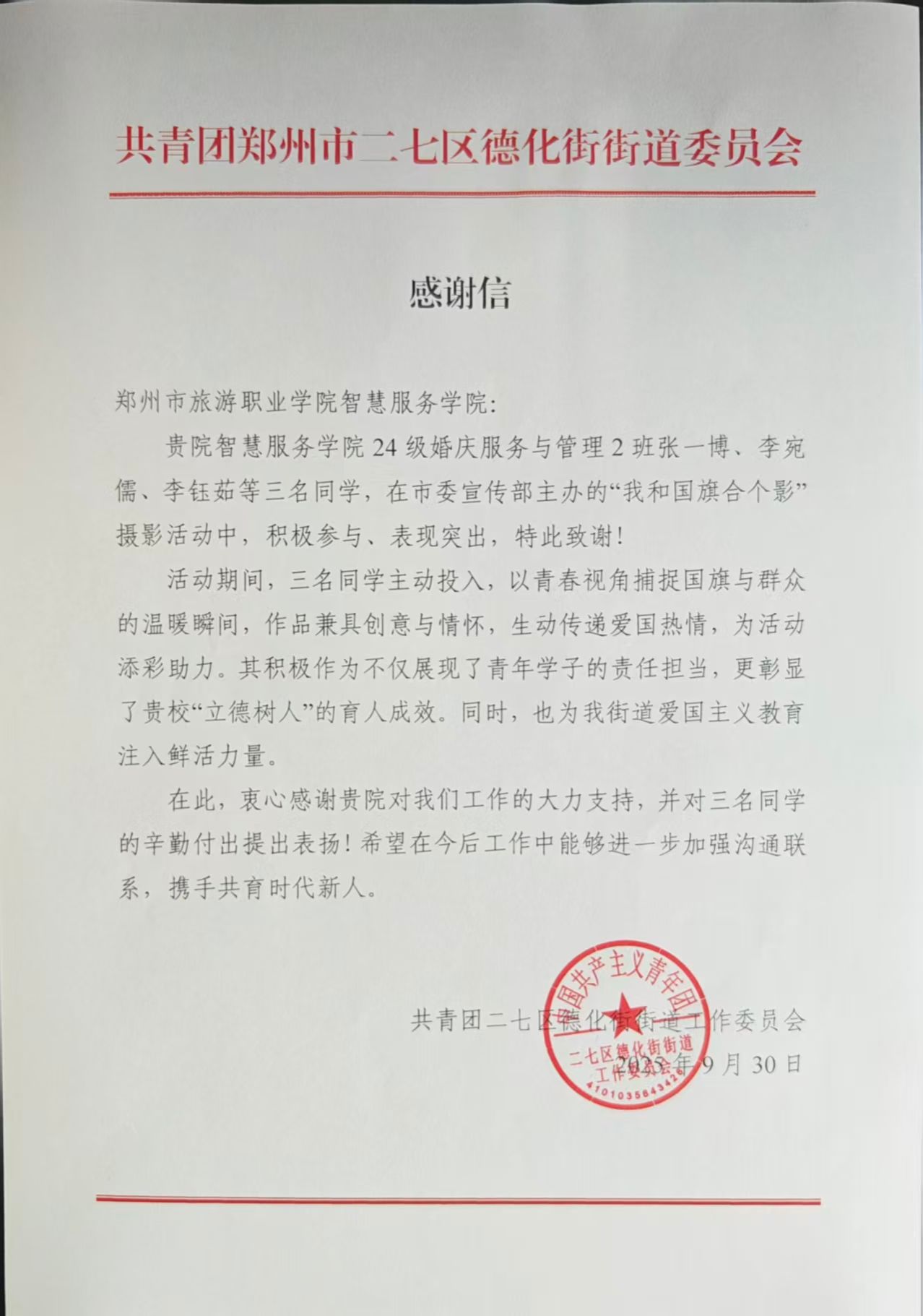 9月30日,郑州市二七区德化街街道委员会向郑州旅游职业学院智慧服务学院发来感谢信,对我院24级婚庆服务与管理2班张一博、李宛儒、李钰茹三名同学在市委宣传部主办的“我和国旗合个影”摄影活动中的出色表现致以诚挚谢意。