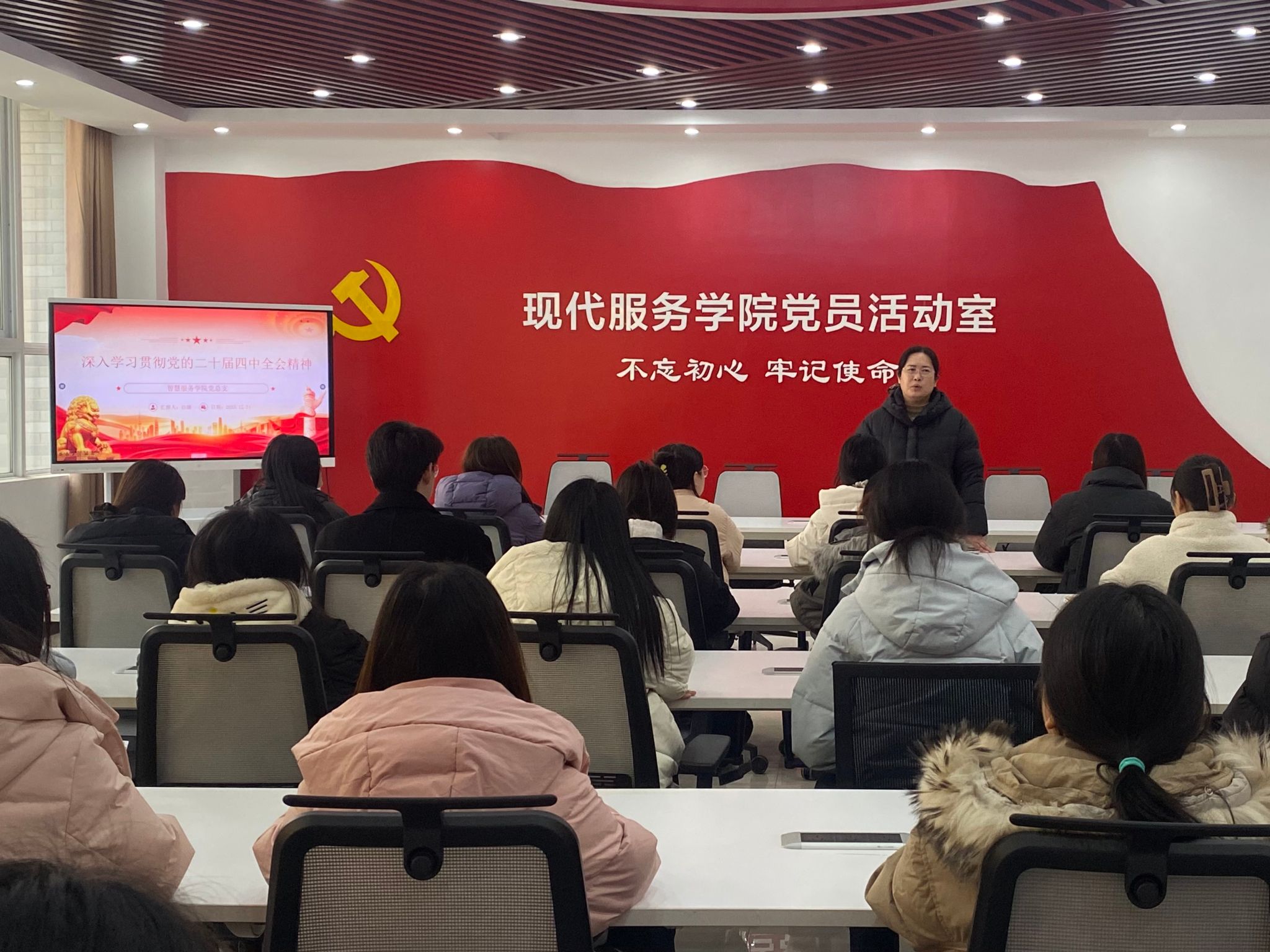 12月24日,智慧服务学院党总支书记白娜以《深入学习贯彻党的二十届四中全会精神》为题,为学院师生讲授专题党课。