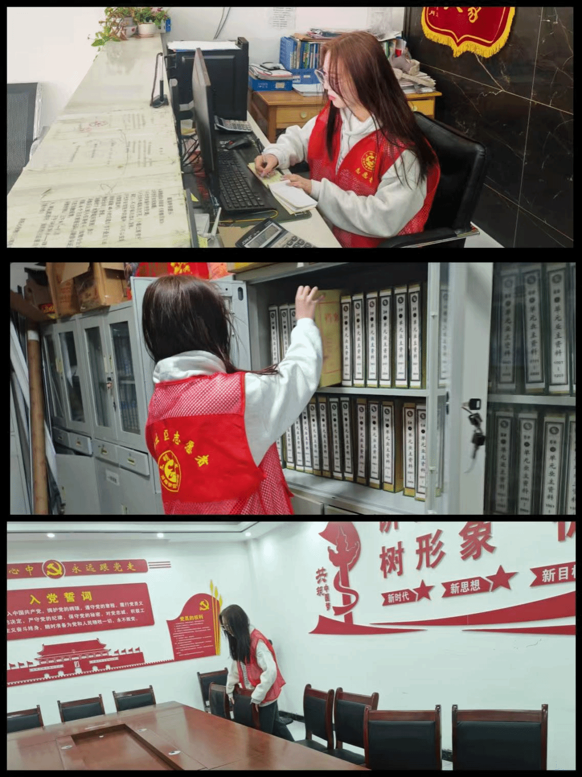 志愿服务的日子里,我的身影穿梭在社区的服务大厅、档案库房与活动会场。坐在服务台前,面对一沓沓需要核对的文书,我学着沉下心来,逐字逐句梳理信息,将居民的诉求与社区的安排精准记录;站在档案柜前,我踮起脚尖,将一卷卷厚重的档案按类别归位,让杂乱的资料变得井然有序,那一刻我明白,这些看似冰冷的卷宗,承载的是社区治理的脉络,是服务群众的初心;走进活动会场,我细致擦拭桌椅、整理环境,看着墙上“树形象”“永远跟党走”的标语,一股使命感油然而生,每一次清扫、每一次整理,都是在为社区的温暖底色添彩。