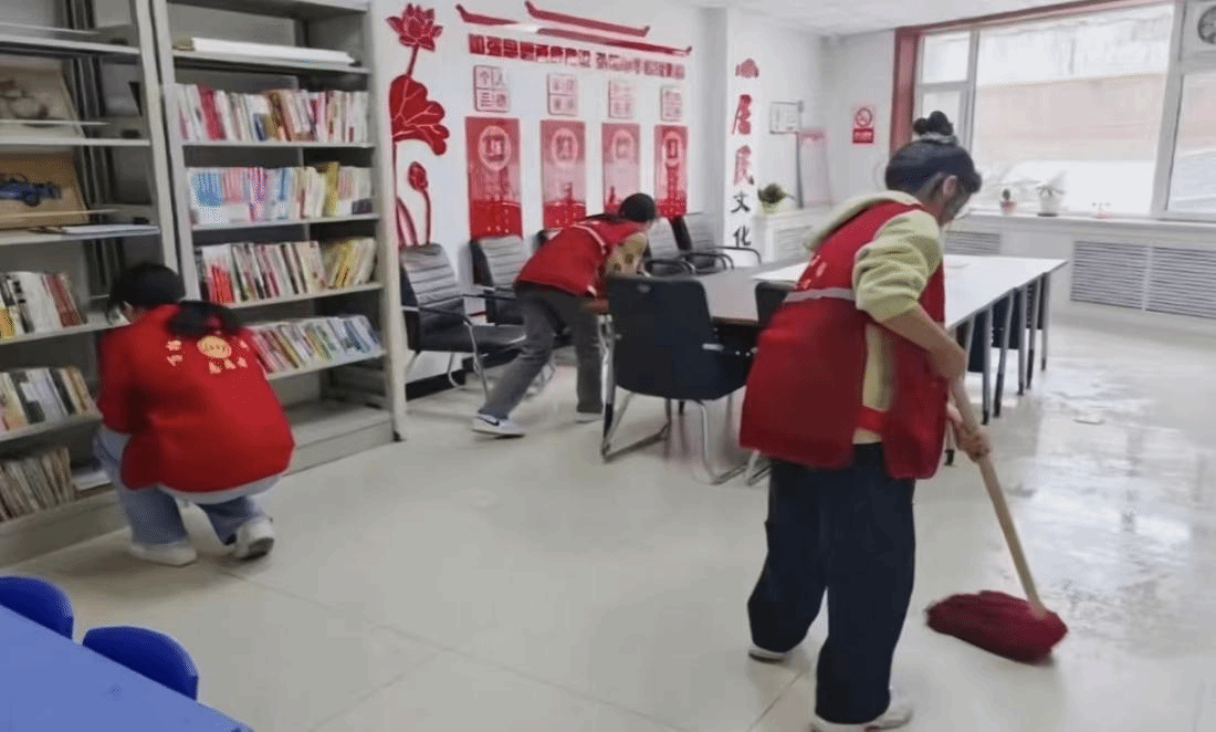 每天清晨,我都会早早的来到社区中心认真清理楼道、擦拭门窗、清扫垃圾,让居民在一个干净舒适的区域看书和娱乐。扫雪的过程更加考验意志,开始手都冻得不能打弯,但齐心协力将道路上的积雪逐一清理后,已经发现衣服都被汗水浸湿了。