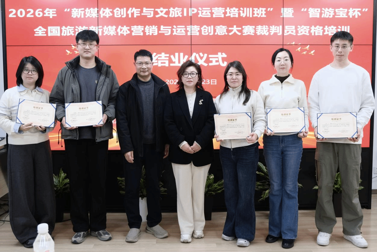 2026年1月20—23日,智慧服务学院婚庆服务与管理专业教师陈昱欣赴浙江参加"新媒体创作与文旅IP运营培训班暨'智游宝杯'全国旅游新媒体营销与运营创意大赛裁判员资格培训",并成功获得该国家级赛事裁判员资格认证,为我校在文旅融合与数字化教学领域再添专业力量。