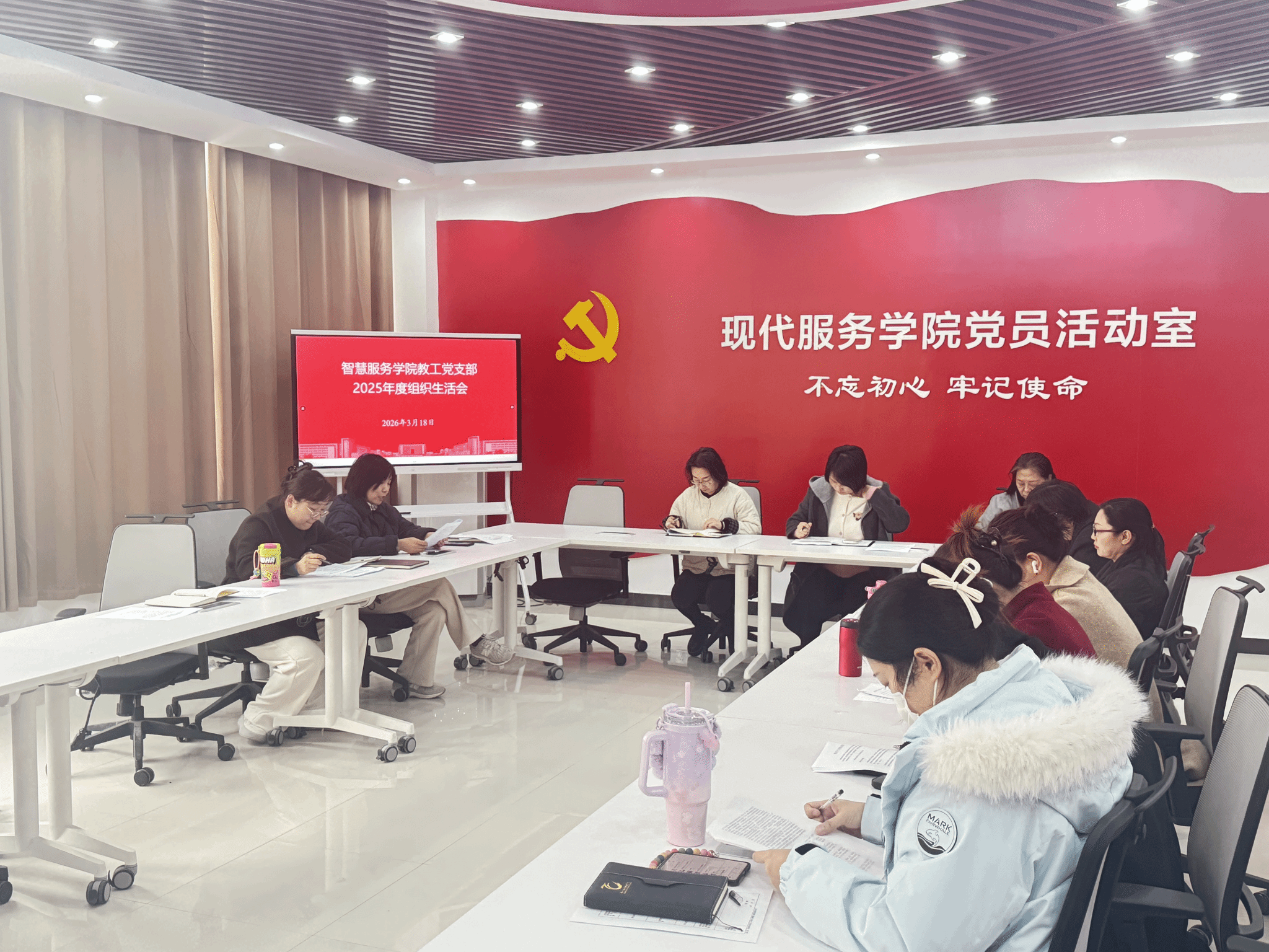 3月18日,智慧服务学院教工党支部在1A208党员活动室召开2025年度组织生活会,并开展民主评议党员工作。会议由党支部书记张莹主持,全体支部党员参加。