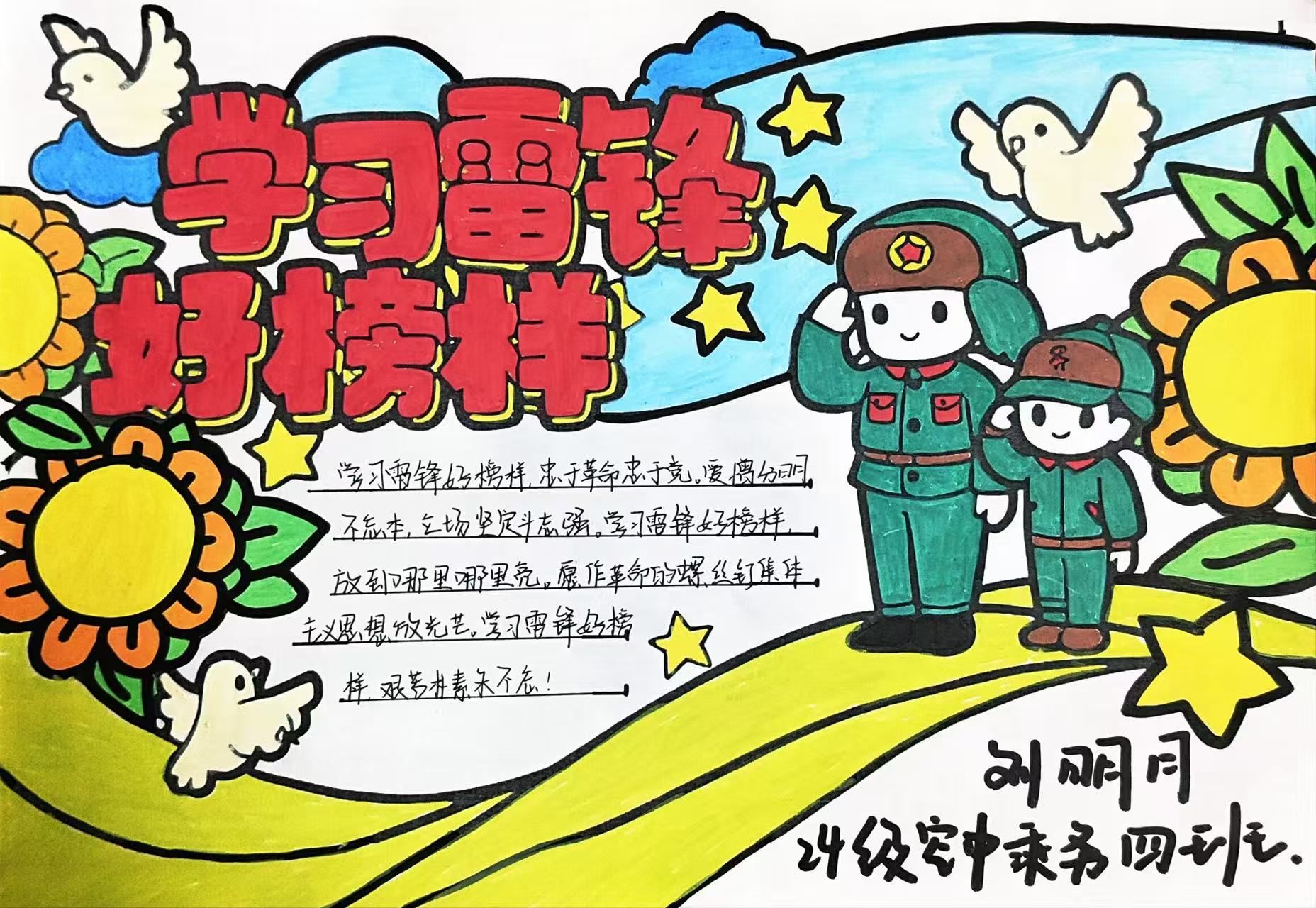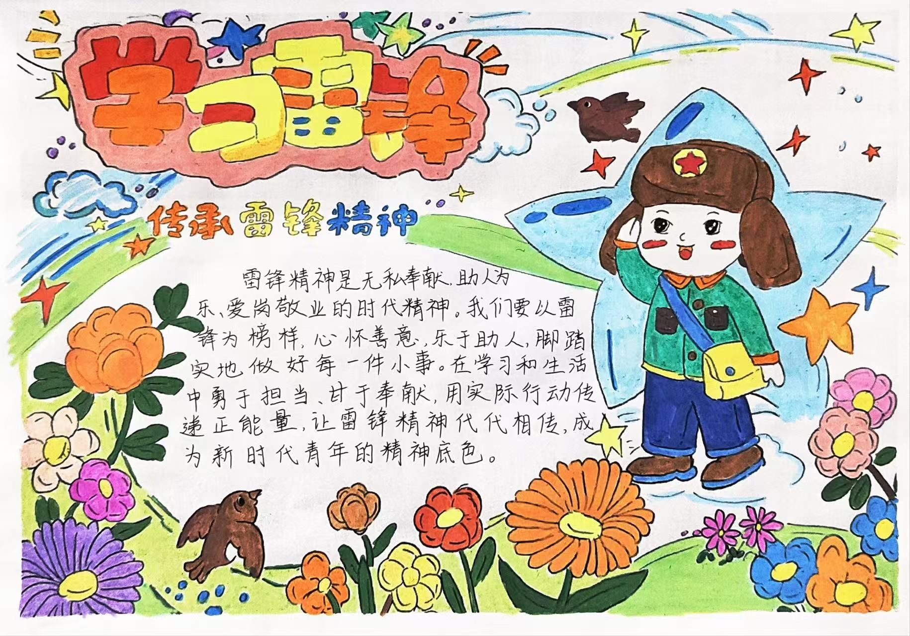 本次活动以雷锋事迹为根基,以奉献精神为内核,面向各班学生征集手抄报作品。我院同学们踊跃响应,查阅雷锋日记汲取灵感,深入研读雷锋精神的时代内涵,在创作过程中重温雷锋同志的平凡善举,感悟“螺丝钉精神”的深刻力量。从版面设计到内容编排,同学们倾注大量心血:有的作品以暖橙为主色调,辅以雷锋帮老弱推车、雨夜送大娘等经典场景,直观呈现雷锋同志助人为乐的高尚品格;有的作品以绿色为底色,搭配“雷锋精神永不过时”“志愿服务我先行”等铿锵标语,彰显新时代青年的责任担当;还有作品摘录《雷锋日记》经典语句,结合当代大学生支教、社区服务等志愿实践,诠释“雷锋精神,人人可学;奉献爱心,处处可为”的深刻内涵。学雷锋主题手抄报活动已落下帷幕,但它带来的触动与思考,照亮我们前行的道路。在绘制手抄报的过程中,大家对雷锋精神有了更深刻的理解,也更加懂得平凡岗位上的坚守与奉献的珍贵。引导青年学生传承雷锋精神、践行初心使命,将爱国之情转化为报国之行。