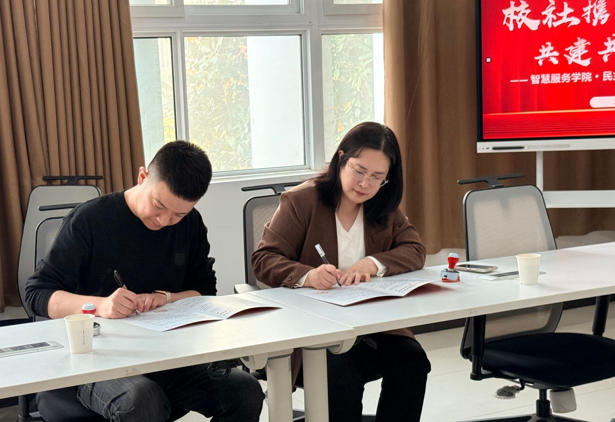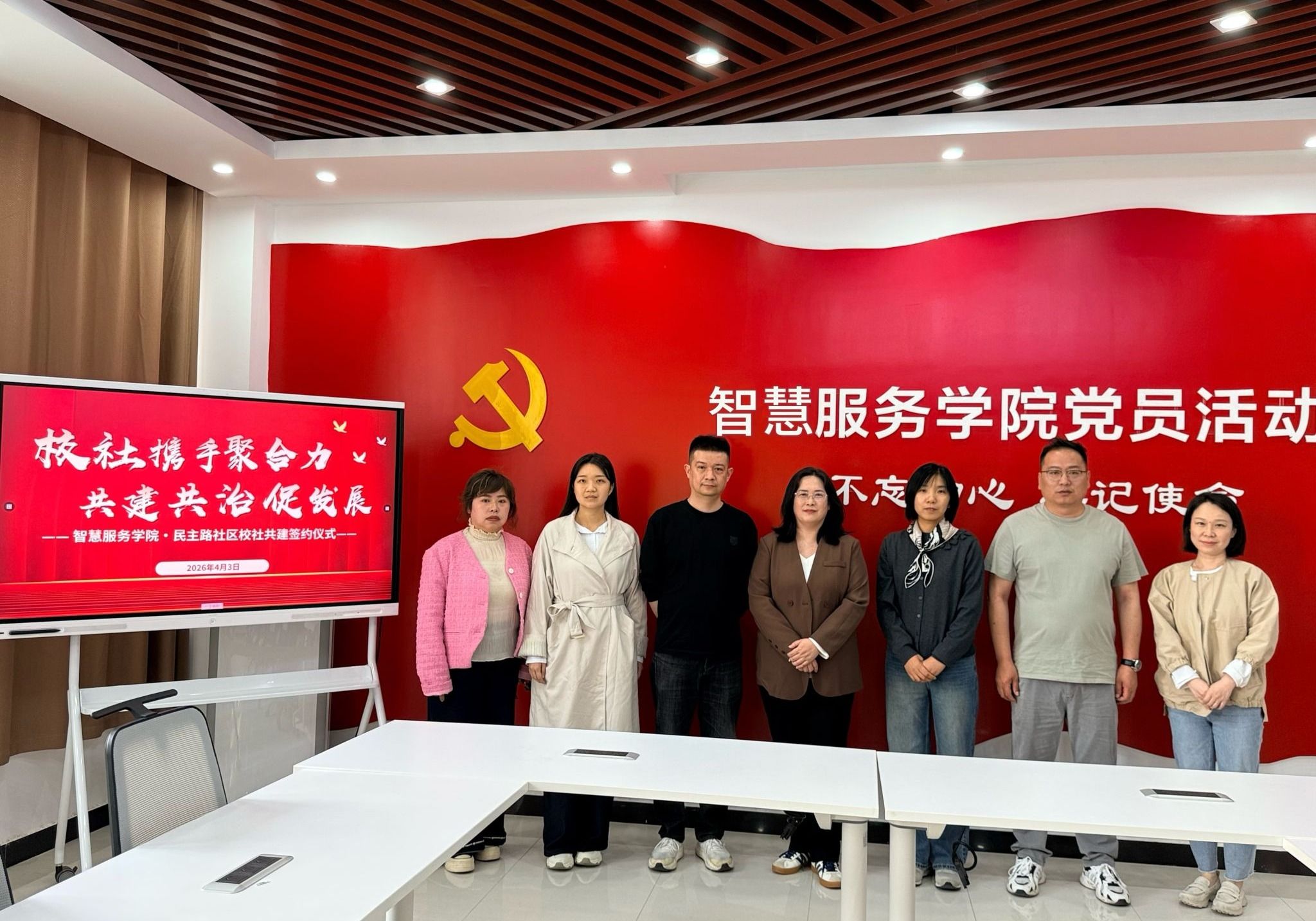 4月3日,智慧服务学院与郑州市德化街街道民主路社区2026年度校社共建签约仪式,在郑州旅游职业学院1号教学楼A座208举行。智慧服务学院党总支书记白娜、民主路社区书记虎欣代表双方签约,学院相关负责人、社区工作骨干及师生代表共同见证。