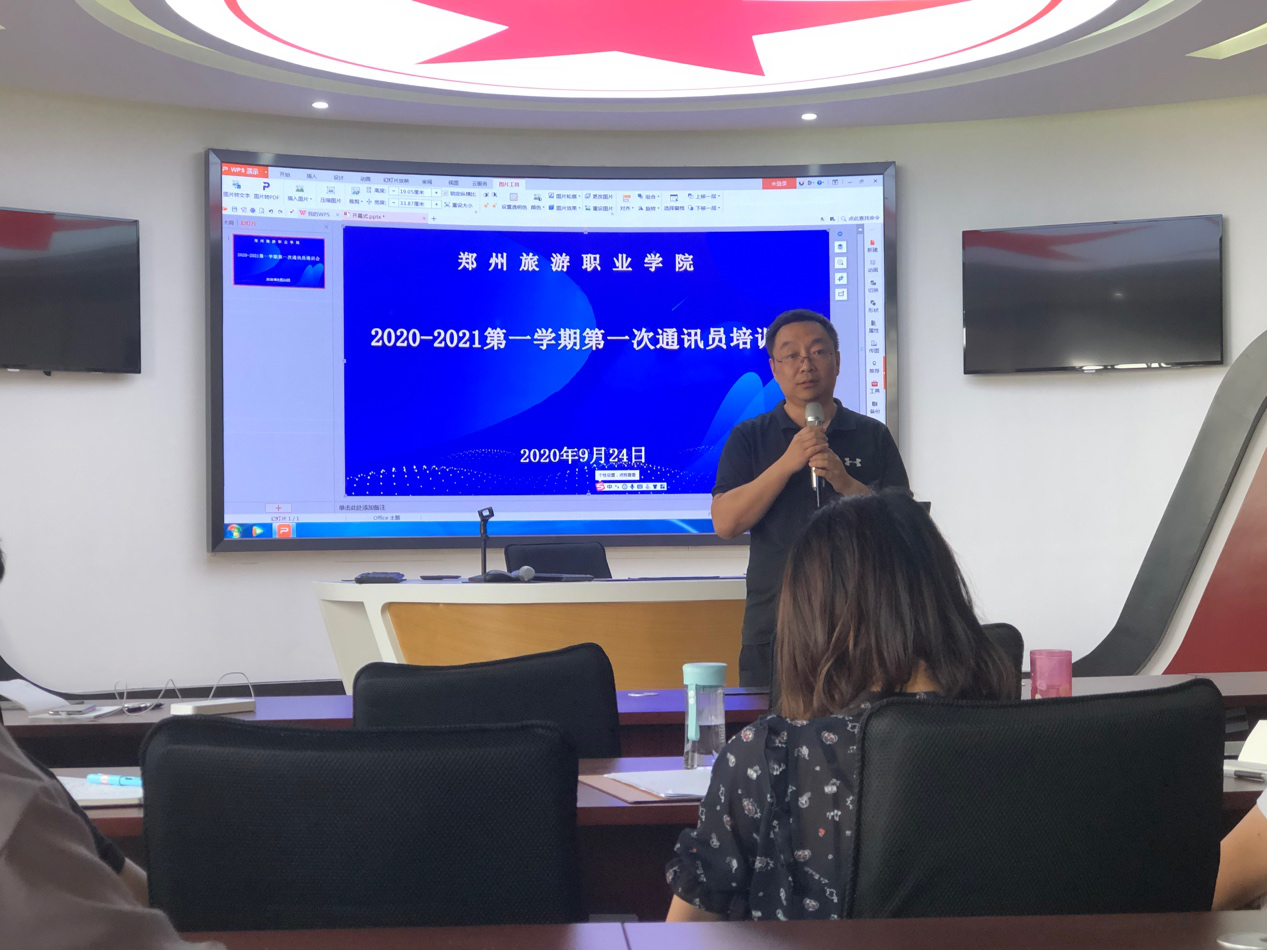 为进一步提高学校对外宣传能力,提升各通讯员队伍的写作水平,9月24日下午,郑州旅游职业学院召开2020-2021年第一学期第一次通讯员培训会。各行政部门、二级学院新闻通讯员,学生宣传骨干参加此次培训。现代服务学院由张钰和秦越代表参加。