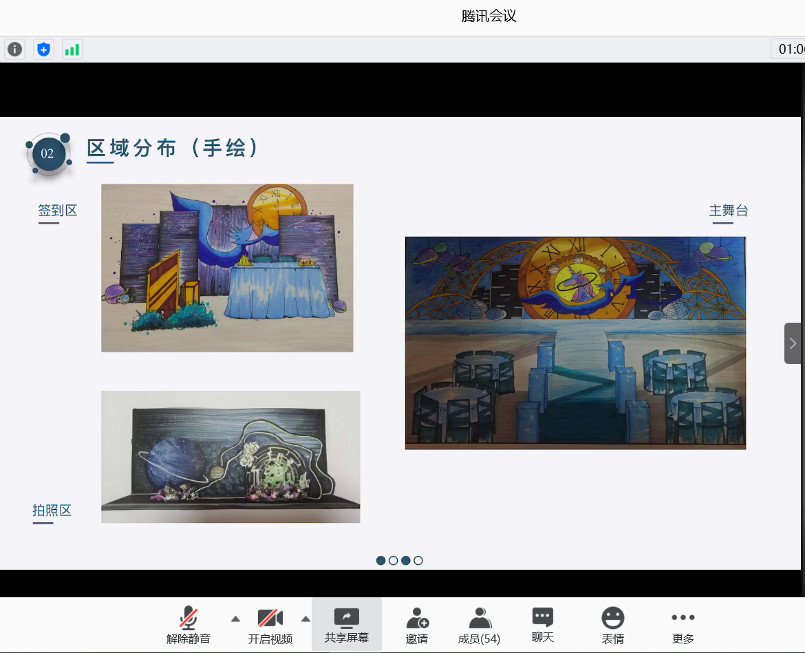 每个小组展示完毕后,由四位教师依次进行提问,8个小组的表现整体较好,也依次提出了不同的意见。整体而言,大家对婚礼提案的完整度把握不够,有的小组缺少配色方案,有的缺少婚礼预算等。同时,对于婚礼中灯光的运用,尤其是基础光、染色光的不同运用,还需要同学们在工作岗位上认真学习。此外,同学们的婚礼手绘要与婚礼提案的主题相一致,达到学以致用的目的。