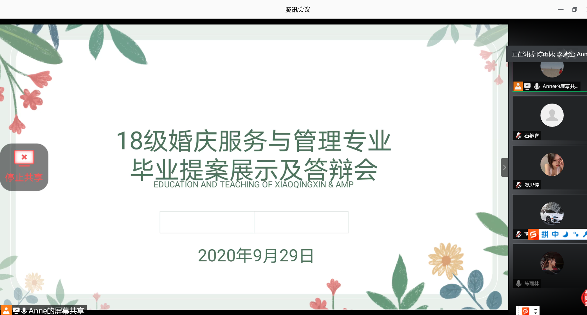 2020年9月29日,婚庆专业通过腾讯会议的形式举行了18级实习生的毕业展示和论文答辩,婚庆教研室主任李文娟、教师段会利、高楷峰、石艳春以及18级婚庆专业的全体学生参与了毕业展示。