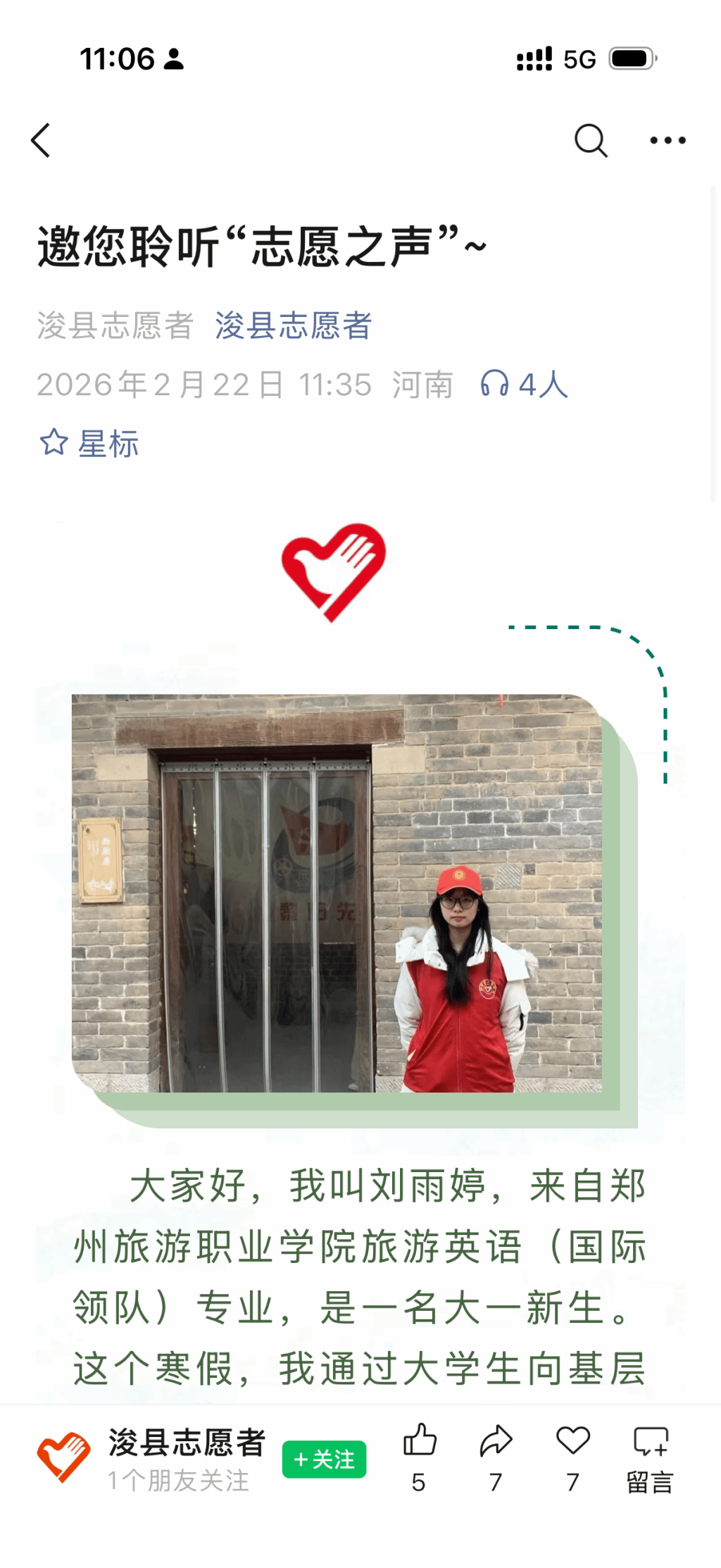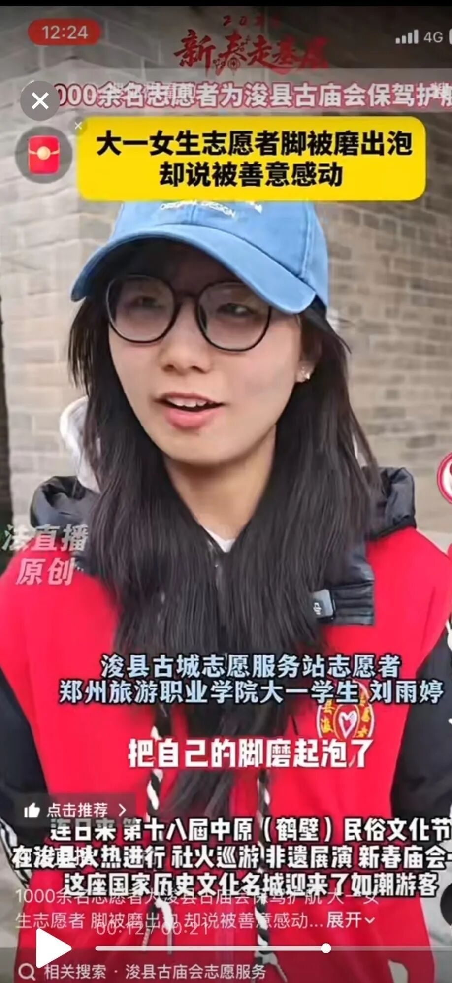 志愿服务中,刘雨婷凭借高度负责的态度与敏锐细致的观察力,成功帮助一名与家人走失的游客顺利团聚。这一暖心善举被 “浚县志愿者” 微信公众号专题报道,赢得当地群众与活动组委会的广泛赞誉。同时,她的优秀志愿服务事迹被河南法制报官方抖音账号“法直播”宣传报道,充分展现了旅院学子心系社会、昂扬向上、乐于奉献的精神风貌。
