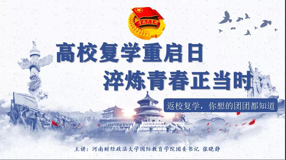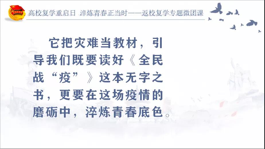 刚刚度过的五四青年节,是全国疫情防控阻击战取得重大战略成果背景下的青年节,在这个共青团员和中国青年满怀崇敬和自豪的日子里,习近平总书记深情寄语,高度赞誉当代中国青年的担当精神。希望新时代中国青年要继承和发扬五四精神,坚定理想信念,站稳人民立场,练就过硬本领,投身强国伟业,始终保持艰苦奋斗的前进姿态,同亿万人民一道,在实现中华民族伟大复兴中国梦的新长征路上奋勇搏击。其言谆谆,其情切切。在抗击新冠肺炎疫情中,广大青年不畏艰险、冲锋在前、舍生忘死,彰显了青春的蓬勃力量,交出了合格答卷;在复学复课的关键时期,更是需要广大青年听从指挥、敢于担当、主动作为,为全省的疫情防控工作和返校复学复课贡献青春力量。为了更好地帮助同学们返校复学,团团特别准备了本次微团课:《高校复学重启日,淬炼青春正当时——返校复学,你想的团团都知道》。