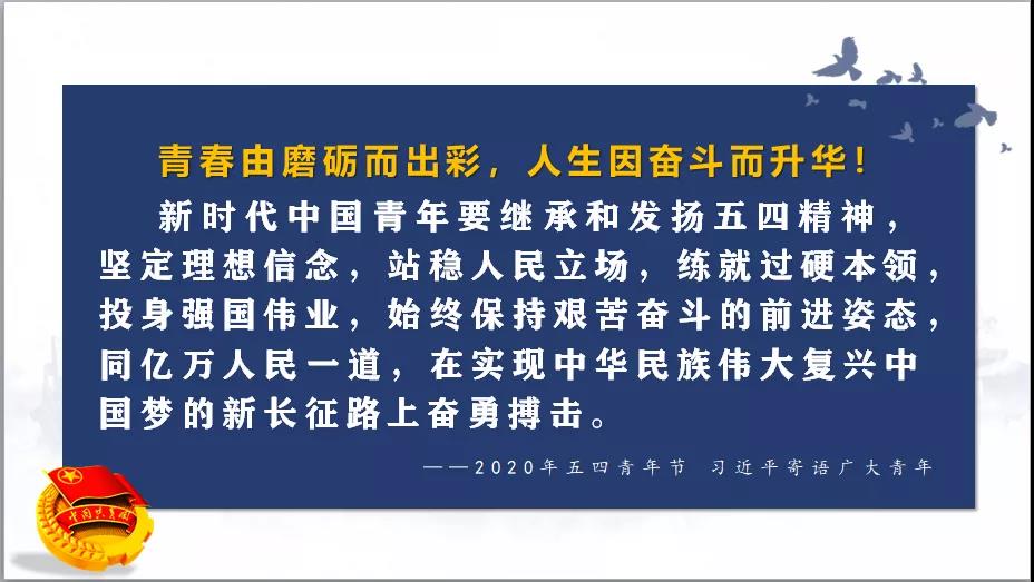 前几天,我们刚刚度过了五四青年节。习总书记指出:青春由磨砺而出彩,人生因奋斗而升华!新时代中国青年要继承和发扬五四精神,坚定理想信念,站稳人民立场,练就过硬本领,投身强国伟业,始终保持艰苦奋斗的前进姿态,同亿万人民一道,在实现中华民族伟大复兴中国梦的新长征路上奋勇搏击。今年团省委五四活动主题是“绽放战疫青春,坚定制度自信”。