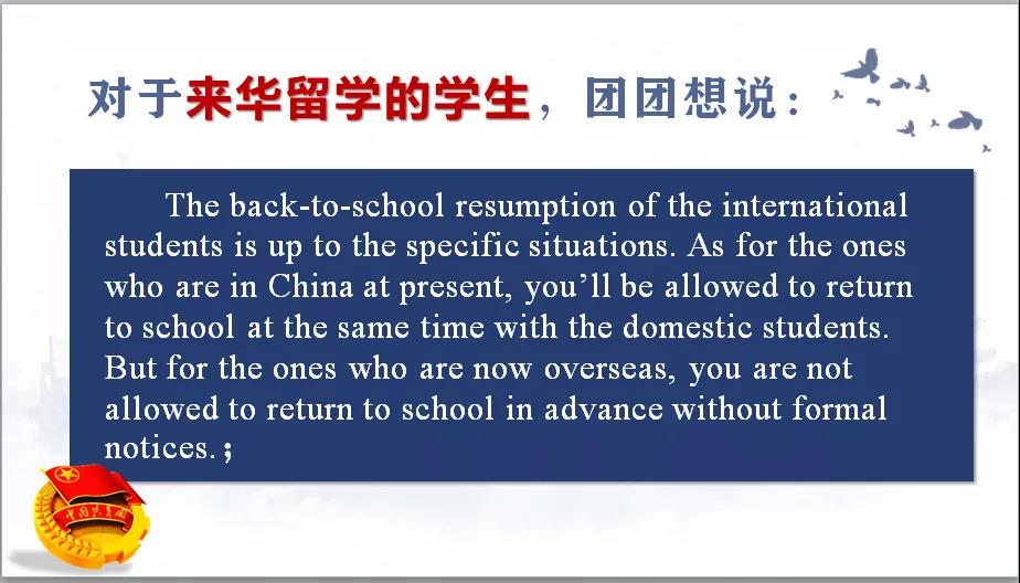 (你们的返校复学要视情况而定。对于目前仍在境内的来华留学生的返校复学工作与国内学生同步进行;在境外的来华留学生在未接到正式通知之前不得提前返校)