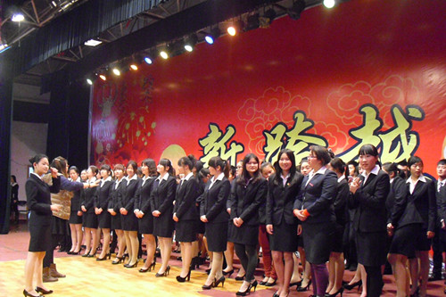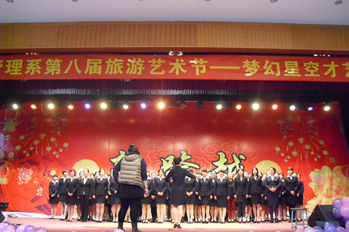 2013年12月4日12时,旅游管理系合唱团在三楼礼堂进行带妆彩排,时晨老师进行指导。