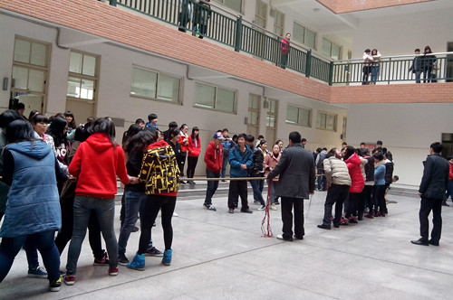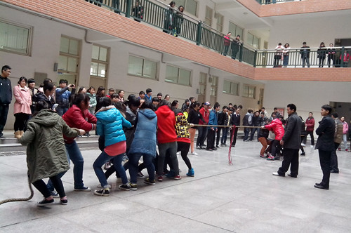 2013年12月5日10时,旅游管理系10级大管班、13级大中专班、13级大管一班和13级大管二班四个班级在西教学楼一楼天井举办拔河比赛。观看此比赛的老师有旅游管理系党总支副书记张笃川老师等。