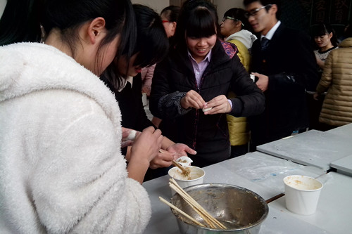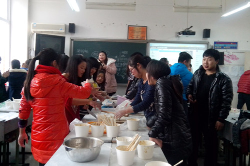 2013年12月20日12时,旅游管理系13级高旅五班全体同学在班级进行冬至包饺子活动,到场的老师有李娟老师、时晨老师和焦金英老师。