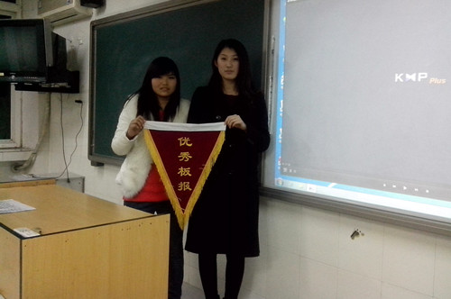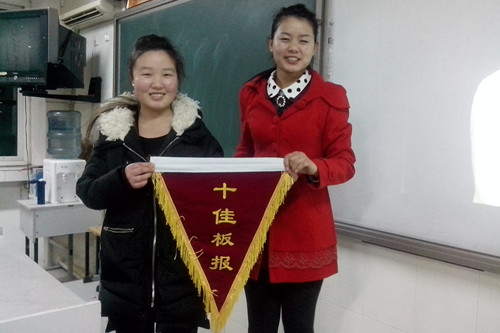 2014年2月27日19时,旅游管理系团总支干事为本期板报评优获得班级颁发红旗。