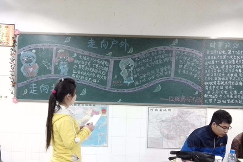 2014年3月19日19时,旅游管理系团总支进行了以“走向户外,走向操场”为主题的第三期板报评选活动,旅游管理系各班都积极参与了此次板报开展活动。12级高旅八班以绚丽的色彩,美妙的设计吸引了大家的眼球;13级高旅六班独特大胆的设计让人为之惊叹;13级社管一班以水彩进行绘图,亮丽的画面让人眼前一亮。同时也希望其他班级再接再厉,为班级挣得荣誉。
