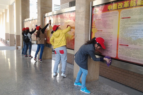 为了积极响应雷锋精神,保护校园环境,同时培养大家保护环境的意识和习惯,提升个人思想道德修养,旅游管理系团总支青年志愿者协会特于2014年3月20日16时组织志愿者开展了“校园清洁,我们都是环保家”活动,志愿者们清理地面、宣传栏及墙壁,把校园更好的一面展现给了大家。