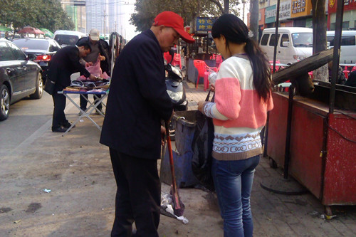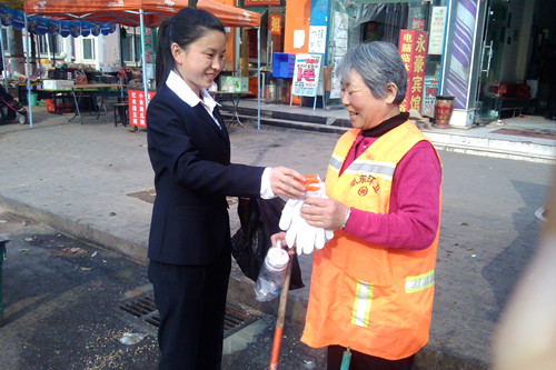 旅游管理系团总支青年志愿者协会利用“一元雷锋人,情系你我心”活动中所筹集的资金为环卫工人送去了手套等用品,环卫工人在接到礼物的时,面带微笑地向青年志愿者协会干事道谢。
