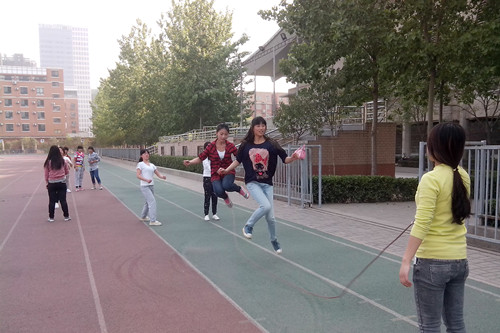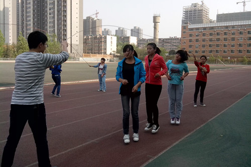 2014年4月9日16时,旅游管理系团总支干事组织13级班级在操场参与“走下网络,走出宿舍,走向操场”之跳绳比赛活动。