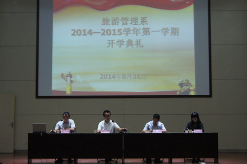 2014年8月31日16时,旅游管理系在我院西报告厅举行开学典礼。旅游管理系主任胡华、副主任秦合岗、张东月、系党总支副书记张笃川以及各位班主任、辅导员老师出席本次开学典礼。
