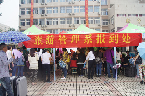 2014年9月9日-10日,14级新生来校报到。旅游管理系志愿者们以一张张热情的笑脸,一句句亲切的问候,一项项贴心的服务,接迎着来自祖国各地的莘莘学子。