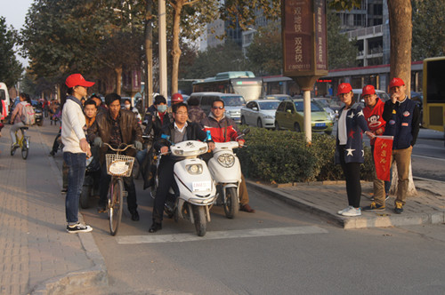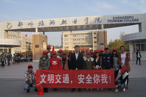 为响应社会文明交通的号召,2014年11月6日16时,旅游管理系团总支于豫英路航海路交叉路口开展了"文明至尚,交通至畅"文明交通执勤活动。旅游管理系辅导员徐亚斌带领团总支青年志愿者协会干事和部分班级志愿者参与执勤。 为本次活动的开展,团总支干事提前做了安排,准备了志愿者小红帽,发放了文明交通小红旗。在辅导员徐亚斌的指导下,志愿者头戴红帽、身披绶带、手举红旗,按照红灯停,绿灯行的交通规则,对行人不走斑马线、非机动车压线、闯红灯和行人中国式过马路等不文明行为进行劝阻,标志性的装束在人来人往的街道上成了一道靓丽的风景线。整个活动在志愿者的努力下,获得圆满结束。 文明至尚,交通至畅,希望大家能从自我做起,遵守交通规则,为创文明城市贡献自己的力量。