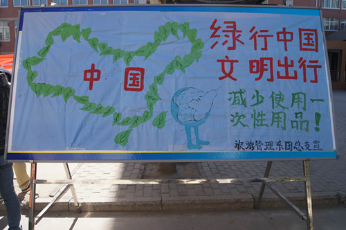 为进一步弘扬社会主义核心价值观,在校园内形成节俭养德、全民节约的良好氛围,旅游管理系团总支以“绿行中国,文明出行”为主题的减少一次性用品环保公益活动于2014年11月12日12时在西教学楼门口举办。