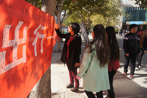 本次活动主要以学校同学签名承诺和留言的方式开展。12时,本次活动的海报和条幅在西教学楼门前展出,在团总支干事的积极宣传下,吸引了同学们的眼球,大家都积极参与,各种语言的签名展现了同学们对参与公益的热情,部分老师也加入了签名承诺的行列,如党政办公室主任张元奎等。