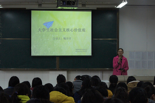 在第四讲“大学生社会主义核心价值观”中主讲老师旅游管理系辅导员魏洋洋以PPT的形式向同学们讲解了当代大学生应具备的社会主义核心价值观。为了加深大家对社会主义核心价值观的正确认识,进行了对价值、价值观、价值体系、核心价值观等概念的细致讲解。她表示希望团员骨干们可以发挥模范带头作用,把这次的学习仅仅当成一个开始,努力做到将社会主义核心价值观内化于心、外化于形,真正成为社会主义核心价值体系的践行者。