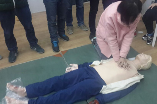 焦梦丽为大家讲述了心肺复苏的操作原理以及实际操作过程可能出现的状况,和处理方法、技术效果等,并在现场进行了互动教学,参训员踊跃实践,并逐个在假人身上进行实际操练,体验实际效果。
