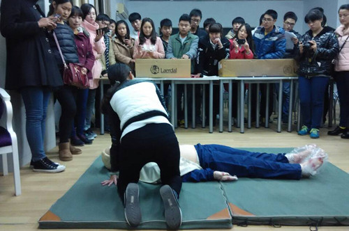 2014年11月25日19时,旅游管理系在东教学楼图书馆一楼心理健康团体活动室参加了红十字会急救员培训活动,培训课上,由来自旅游管理系13级的焦孟丽同学在现场利用假人向各系参训学员讲述心肺复苏的处理常识。