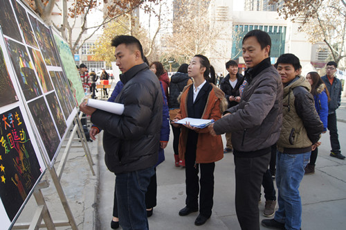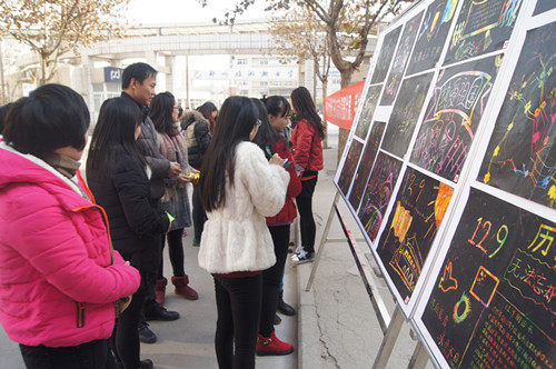为了推进大学生们对艺术的追求,鼓舞同学们发挥自身潜能,推动学校全面发展,由郑州旅游职业学院院团委主办,旅游管理系承办,经济贸易系和旅游外语系协办的“革命历史,梦想未来”纪念12.9图片展、手抄报展、手工漫画展,于2014年12月23日12时在西报告厅门口举办,出席本次活动的评委老师有:院团委书记朱宇,院团委副书记岳正阳,院团委组织部部长崔灵玲,院团委宣传部部长刘嘉佳,学生处管理科科长许翔。