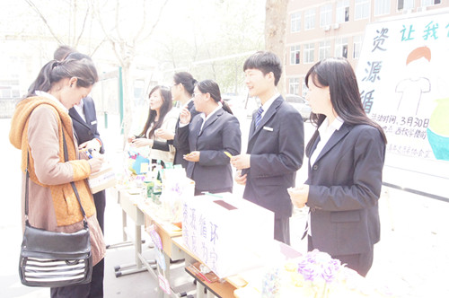 为了积极宣传环保知识,增强广大同学的环保意识,建立“环保校园”,为具有手工艺制作特长和爱好的同学提供一个展示自我的舞台,旅游管理系团总支干事于2015年3月30日12时在西教学楼门口开展了“资源循环,变废为宝”作品集投票活动。