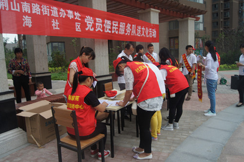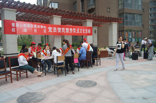 2015年5月21日8时,郑州旅游职业学院旅游管理系团总支青年志愿者协会干事组织五名志愿者走进郑州市馨家苑社区服务中心,参与了紫荆山南路街道办事处和航海社区联合举办的党员便民服务队送文化活动。