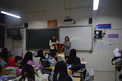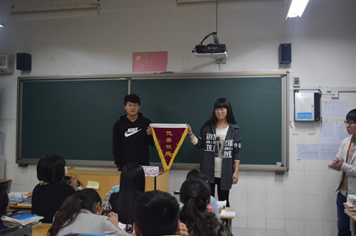 2015年10月29日19时,旅游管理系团总支宣传部干事为获得院十佳和系优秀板报的班级颁发了红旗,给予鼓励。