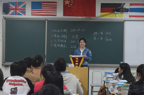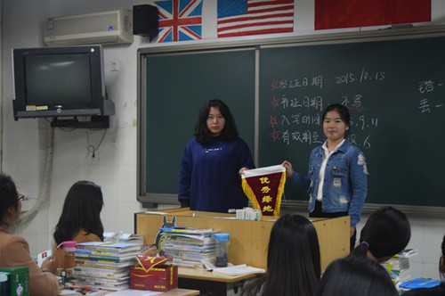 2015年11月2日19时,旅游管理系团总支办公室干事为获得十佳绿地和系优秀绿地的班级颁发了红旗,给予鼓励。