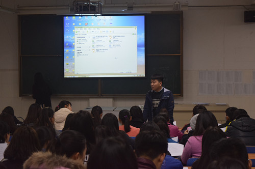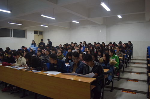 2015年11月12日19时,旅游管理系团总支干事于西教学楼203教室举行了12.9大合唱合唱团的培训。