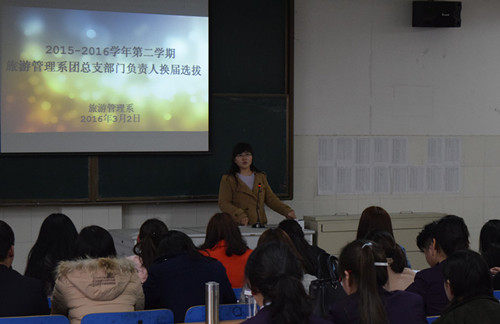 旅游管理系团总支于2016年3月2日下午16时在西教学楼203教室为竞选新一代部长和学生书记的竞选者们搭建了一个舞台,让他们在这里展现出这一个学期以来自己所得到的,并简要的叙述了对未来学生工作的憧憬,展示自己的领导和管理能力,开展了新一轮学生干部竞选活动。