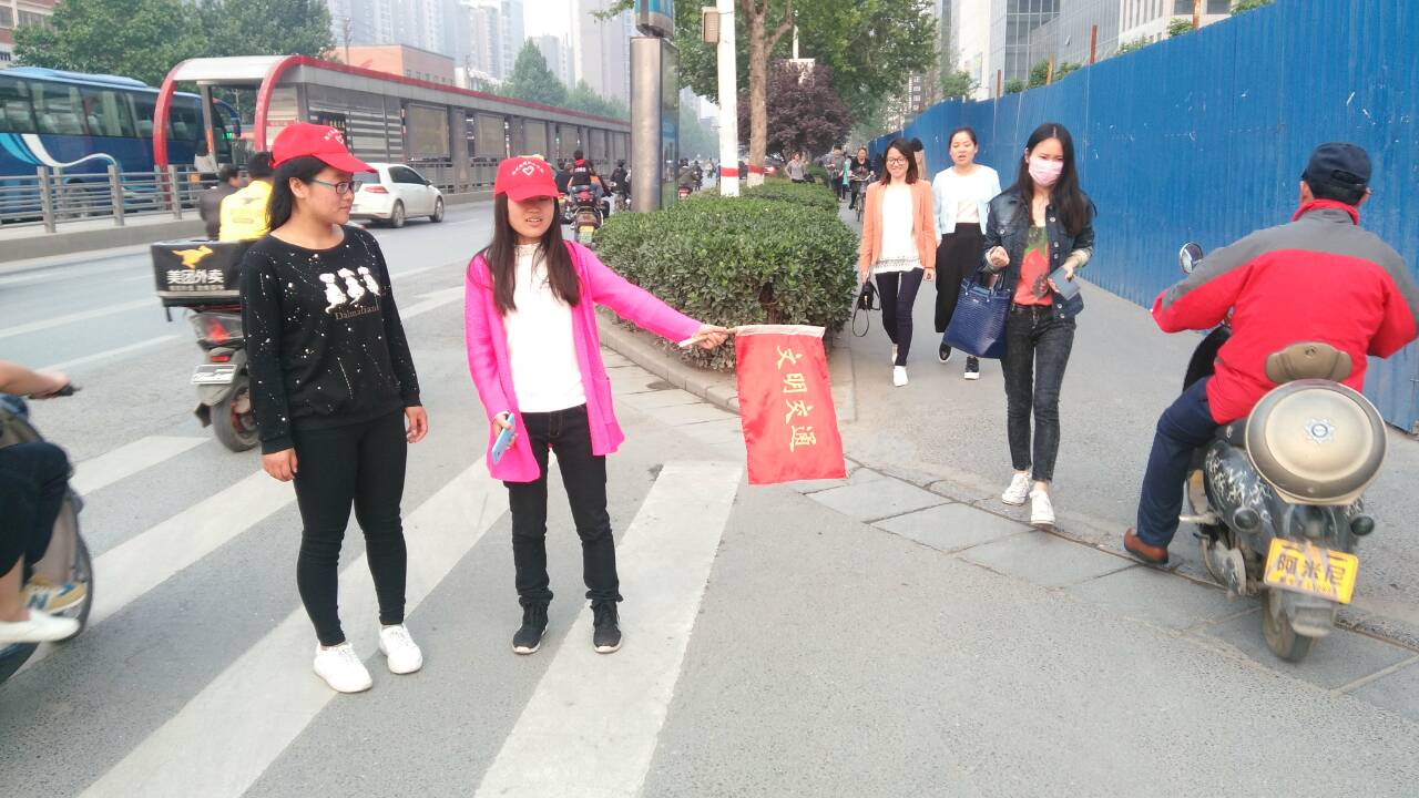 4月28日17时,旅游管理系团总支干事组织志愿者们在西教学楼门口集合,前往航海路豫英路交叉口开展了“世界安全日”活动。