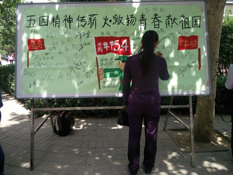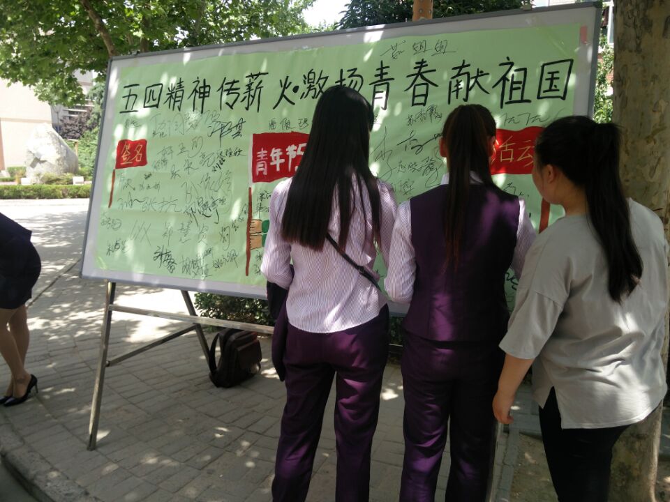 5月4日12时,旅游管理系团总支干事在西教学楼门口举行郑州旅游职业学院旅游管理系“五四青年节”签名活动。