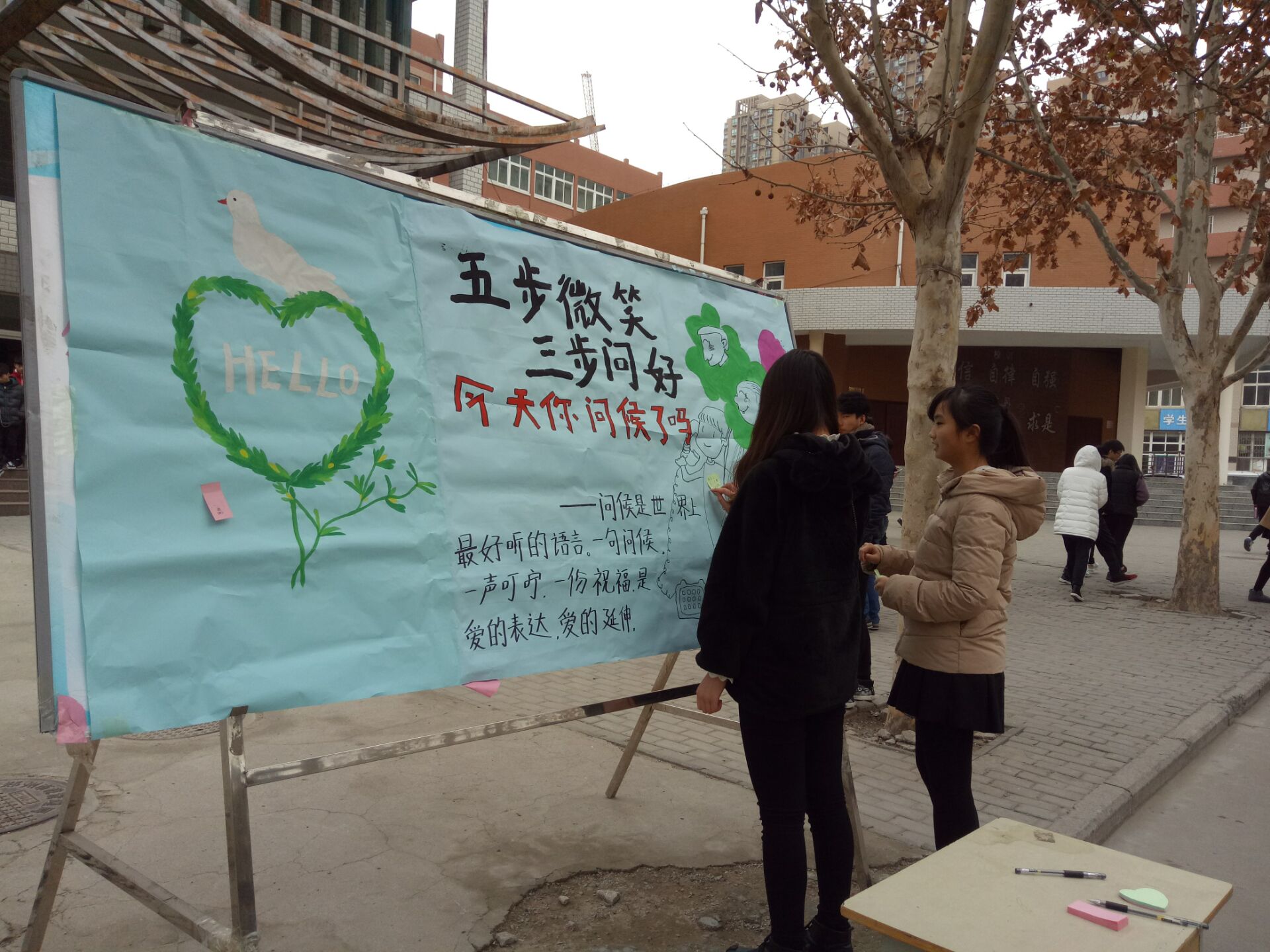 他们用各种方式引导同学们相互问候,同学们走进清洁阿姨及其他工作的人们送上浓浓的微笑与亲切的问候;有的同学把自己的祝福写在纸条上给远方亲人送去暖暖的祝福;更有同学则大方地和同伴一起握手拥抱问候;体验问候传递真情。