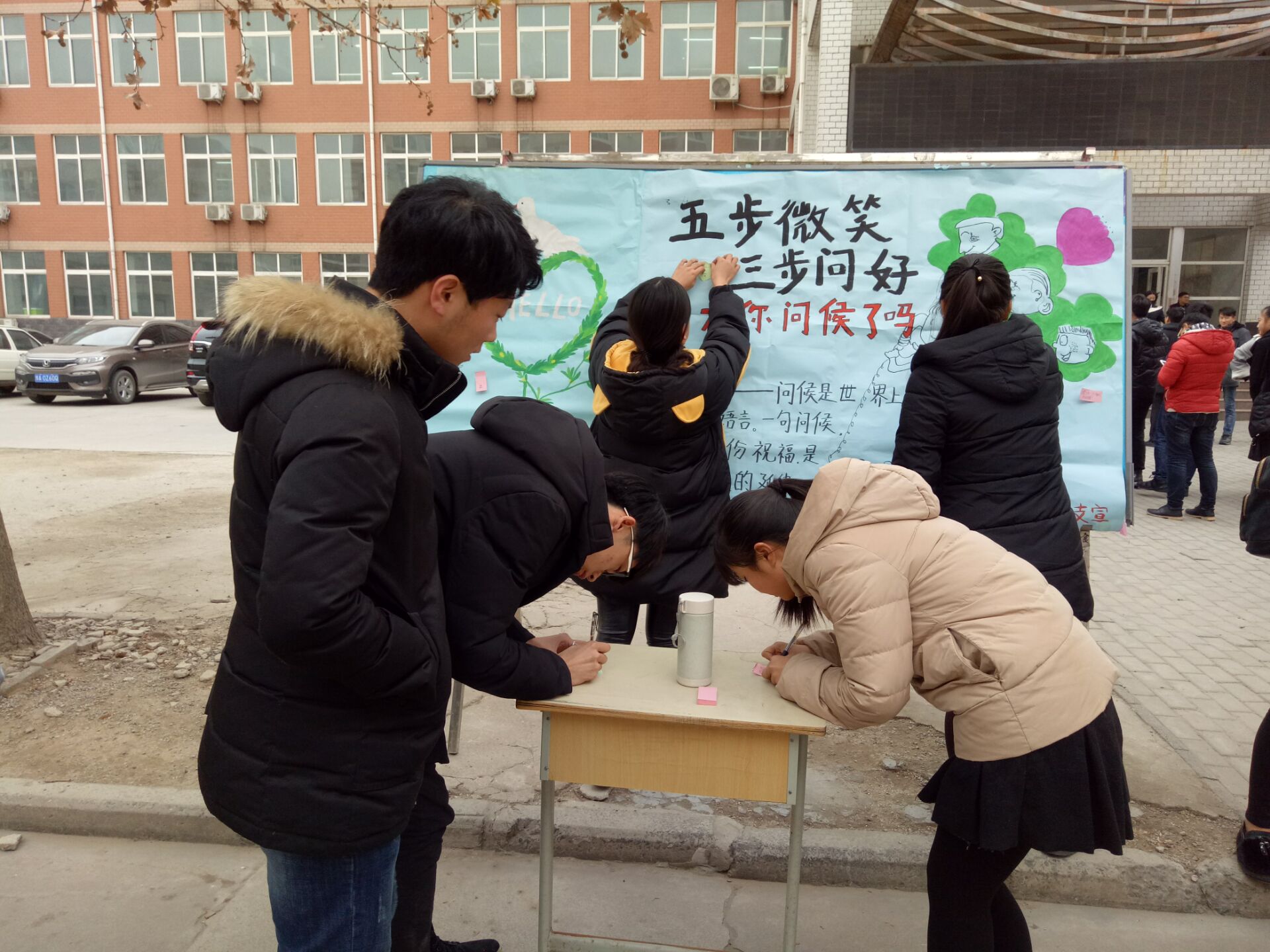 为了培养现代大学生们的关爱,养成文明礼貌的习惯,弘扬人间温暖和关爱,更为促进同学们与他人的交往,大胆表达问候语言,并通过自己的良好祝愿与问候增进人与人之间的和谐共处,我院旅游管理系团总支青年志愿者协会在本系门口开展了“问候传真情”的主题活动。