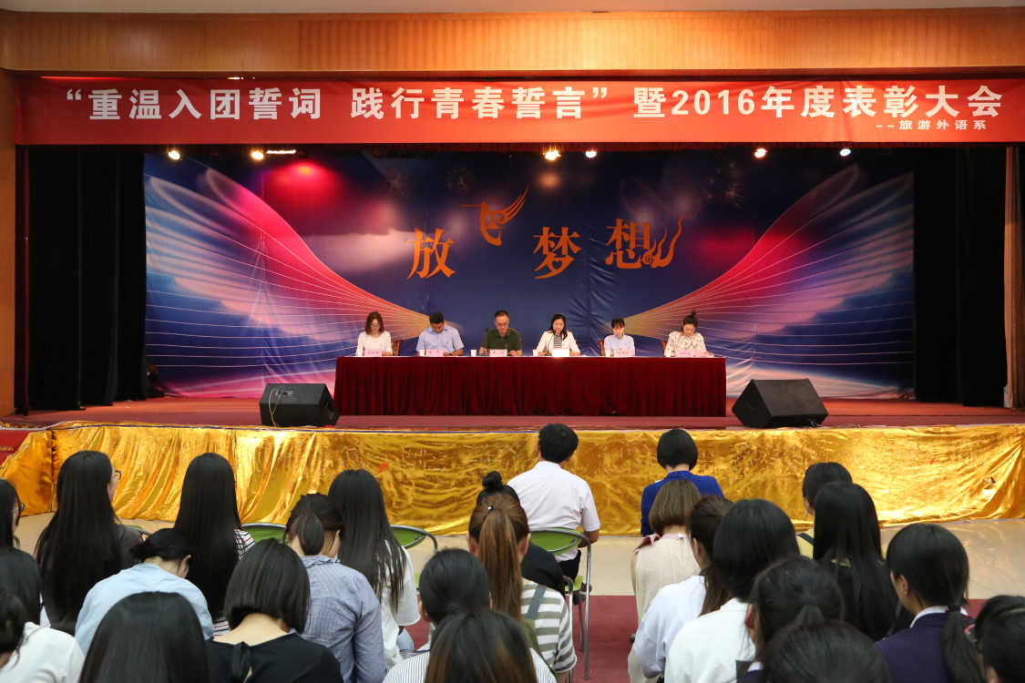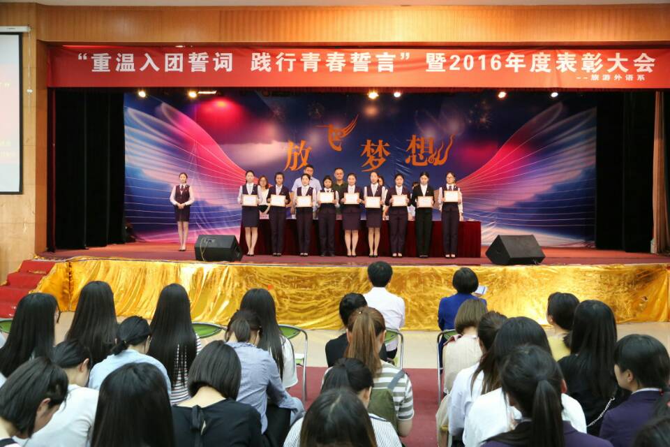 2017年5月9日下午四时,旅游外语系在二号餐厅三楼礼堂,举行“重温入团誓词,践行青春誓言”暨2016年度表彰大会,我系团总支书记刘晓丹担任主持。并由我系党总支副书记王磊,辅导员刘好好老师,黄中老师,务婧博老师,马乔钰老师为获奖集体及个人颁奖。