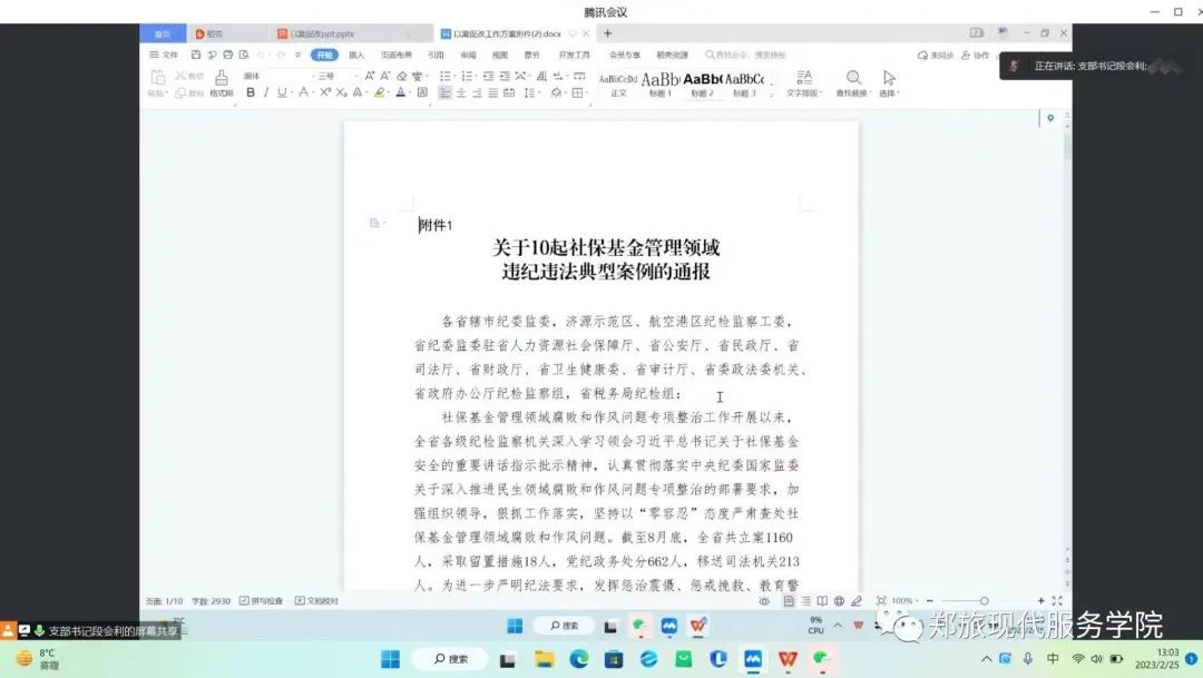 为了增强支部党员的廉洁意识,提高政治站位,2023年2月25日,现代服务学院学生党支部根据《关于10起社保基金管理领域违纪违法典型案例的通报》召开以案促改学习讨论会,开展警示教育,筑牢廉洁思想防线。会议由支部书记段会利主持,支部教工党员和学生预备党员参加会议。